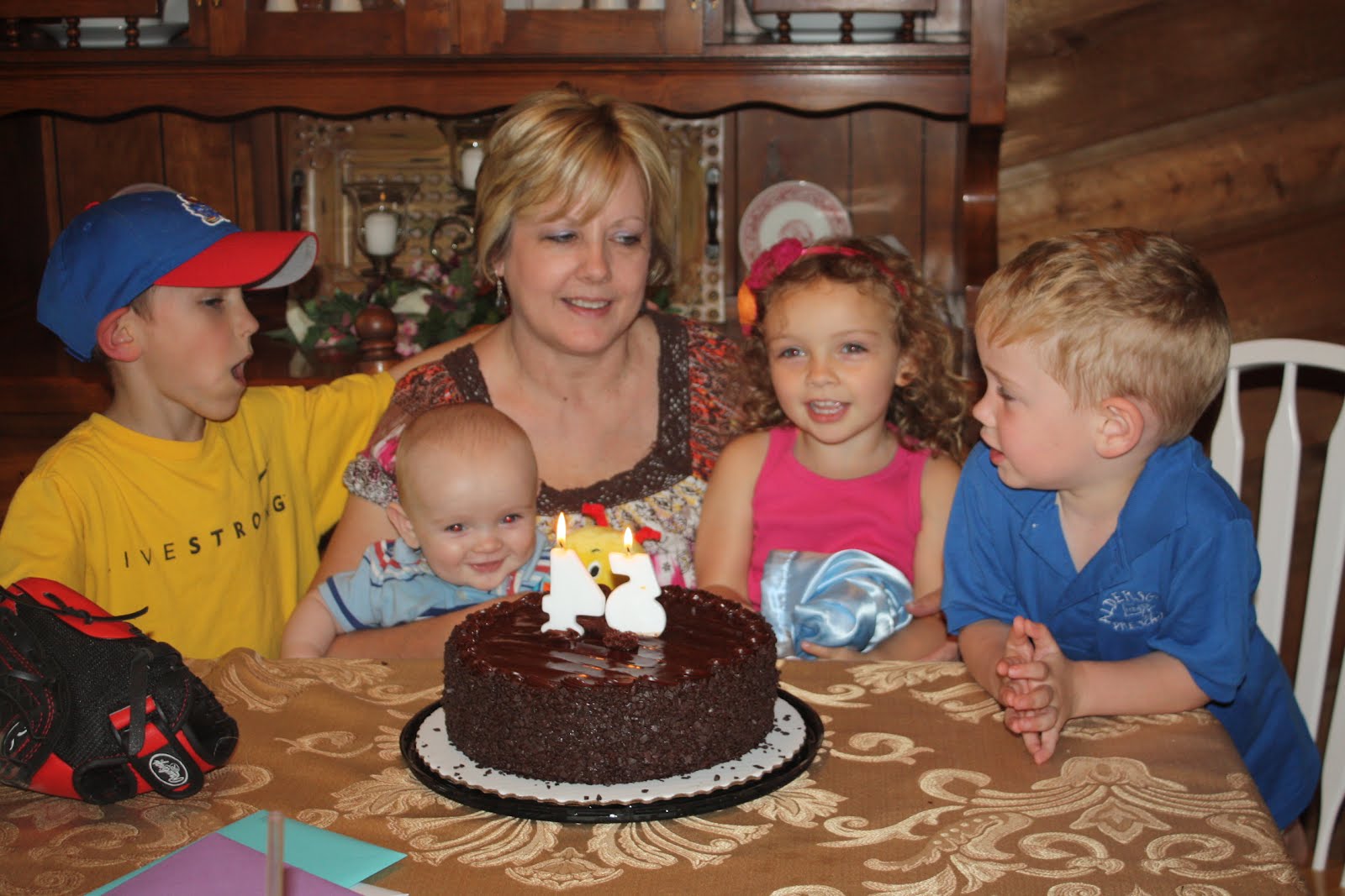 This week we got to celebrate Nana's birthday! Nana picked Papa's yummy steaks, baked potatoes, salad, green beans and Grandmother made some delicious rosemary rolls. She had a chocolate mousse cake for dessert! The kids love singing Happy Birthday and we got some pretty cute pics of all of them with Nana! These babies love their Nana but then again what is not to love about one of the sweetest most loving and patient people I know! I love her too! Ava Kate has really enjoyed celebrating all these birthdays the last few months and she is so sweet about telling everyone Happy Birthday and takes such delight in giving birthday gifts, I love her sweet little heart!